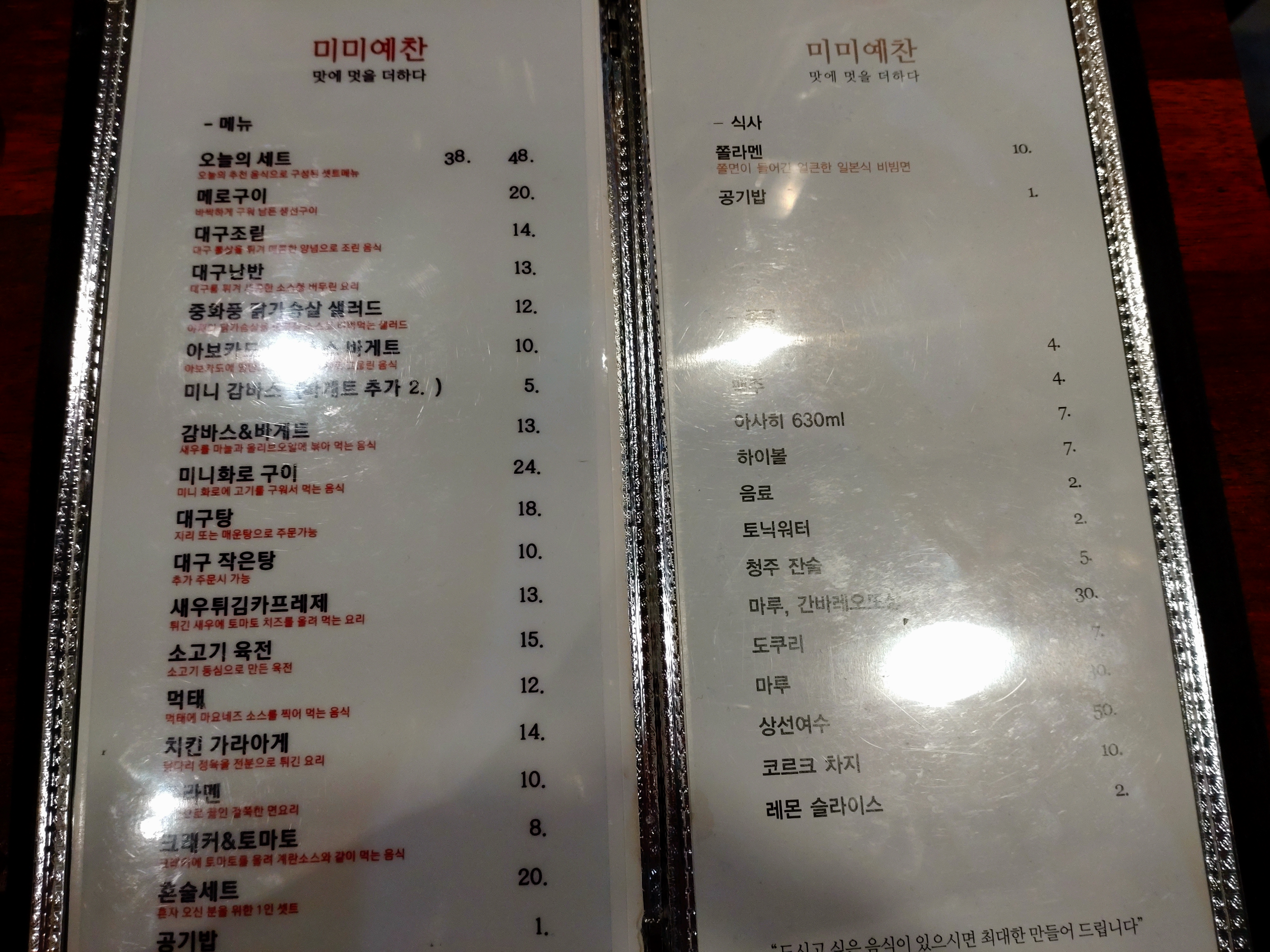 미미예찬의 가격표입니다.
