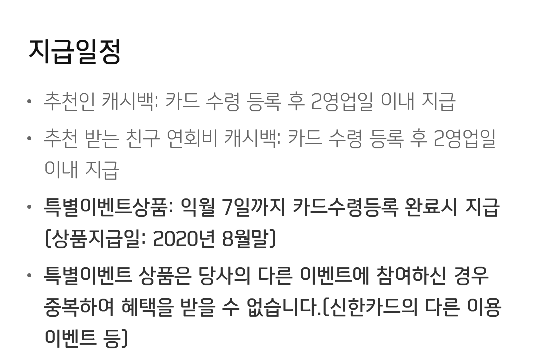[캐시백 서비스 유의사항] 캐시백 서비스는 신한카드 Deep ECO로 전월(1일~말일)의 거래 시점 이용 금액이 30만원 이상인 경우 제공됩니다. 단기카드대출(현금서비스)/장기카드대출(카드론)/연회비/각종 수수료/이자(할부수수료, SMS이용수수료, 연체이자 등)/거래 취소금액/기프트카드 구매금액/선불카드(선불전자지급수단 포함) 충전금액은 실적 합산에서 제외됩니다. 캐시백 한도는 월(1일~말일) 3만원 입니다. (교통/온라인&Recycling/Paperless 서비스 통합) 캐시백 서비스는 교통/온라인&Recycling/Paperless 서비스에 대해 ECO 캐시백 포인트로 적립 후 해당 거래의 결제일+2영업일 이내에 결제계좌로 입금됩니다.